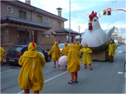 Gran figura hinchable alusiva a una gran gallina, simulando el juego de la gallinita ciega, va acompañada de 8 personajes a pie, con grandes balones blancos (a modo de huevos) que van lanzando al público y jugando con él. Elemento muy vistoso.
