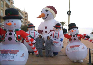 Hinchable de grandes dimensiones, en la foto del centro andarines (el manipulador va dentro), el de la foto de la izquierda está instalado sobre una turbina y lanza confeti por el sombrero, seis animadores se hacen cargo de esta animación a elegir entre uno de los grandes y se completa con dos andarines como los del centro y el resto de los animadores van vestidos de esquimales.