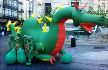 Dragón Roberto, juega con los niños gracias a los seis animadores que se encargan de manejar a Roberto y los huevos de dragón, se mueve sobre plataforma.